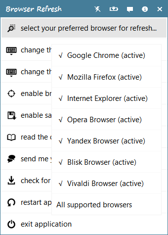 Browser Refresh is a portable Windows application that is designed to help Web Designers and Developers quickly refresh their browsers from anywhere with one keystroke. It currently supports Google Chrome, Google Chrome Canary, Mozilla Firefox, Firefox Developer Edition, Internet Explorer, Opera Browser, Yandex Browser, Blisk Browser, and Vivaldi Browser. It’s supported on all major and modern operating systems, namely, Windows XP, Vista, 7, 8, 8.1, and 10.