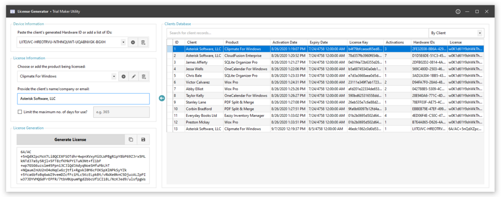 - Generates hardware-locked licenses based on clients' Hardware IDs.