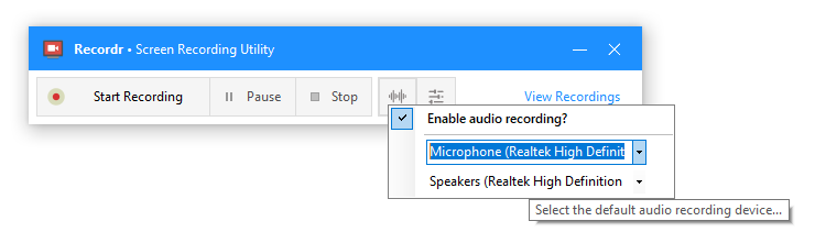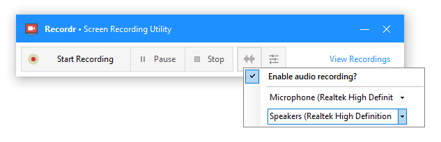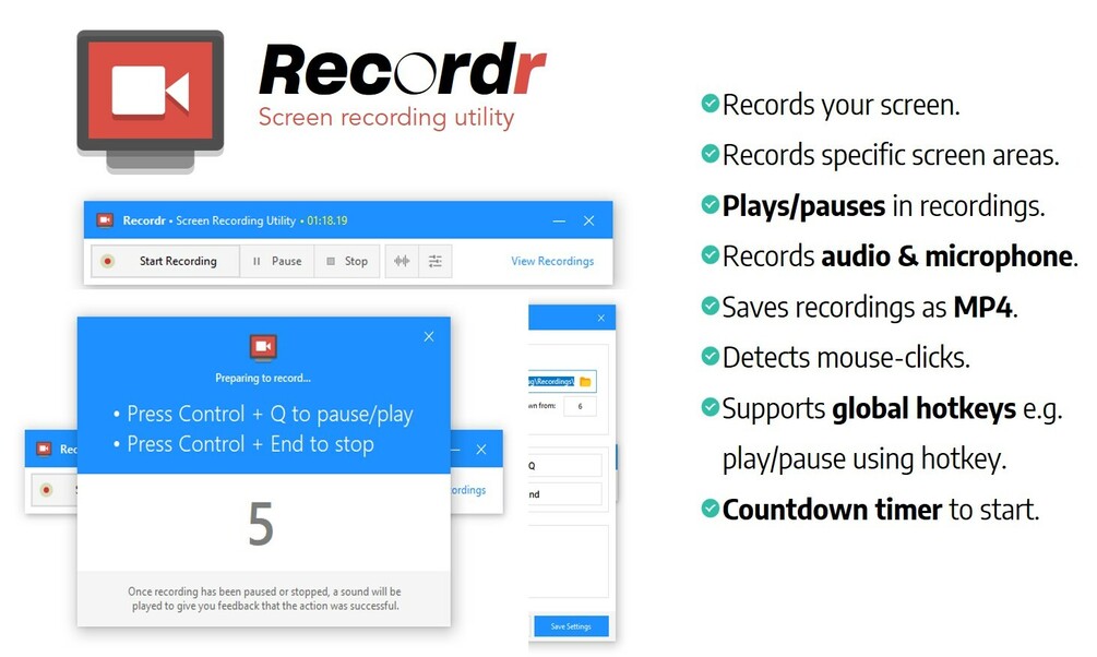 Recordr is a cute, lightweight and professionally crafted .NET Windows screen recording utility that lets you record your screen or any part of your screen and save it as a video file in high quality MP4 format.
